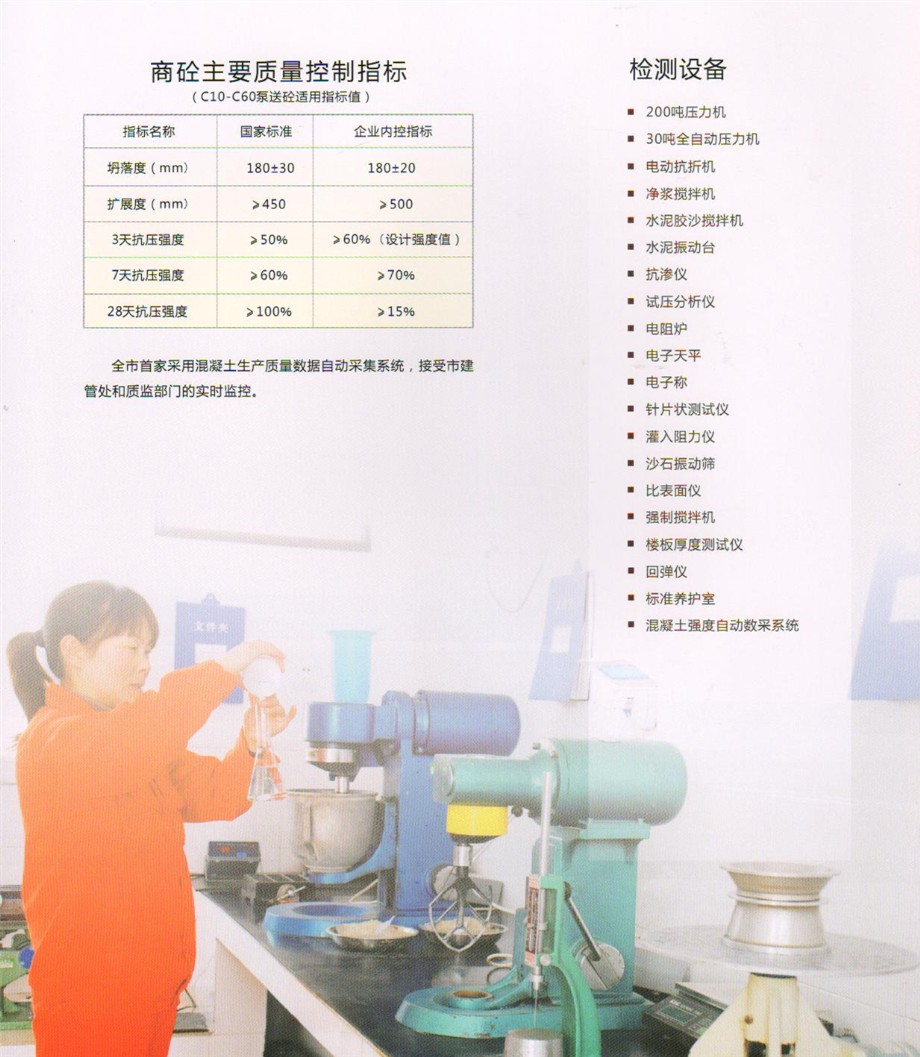 公司設有先進的實驗室,配備全套混凝土及原材料檢測試驗設備,配有專職的試驗、檢驗人員,可承擔混凝土的材料性能試驗,工藝質量控制、產(chǎn)品質量檢驗等全部試驗、檢驗項目,為確保混凝土質量提供了可靠的保證。